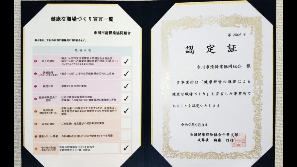 当組合が運営しております「ごみ収集コールセンター」「大型ごみ受付センター」「事務局」において、全国健康保険協会(協会けんぽ)に「健康な職場づくり宣言書」を提出し、認定証をいただきました。職員の健康保持、健康増進に積極的に取り組んでまいります。